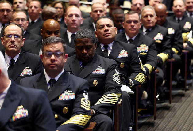 今年9月30日,在弗吉尼亚州匡提科海军陆战队基地聆听赫格塞思与特朗普演讲的美军将领。