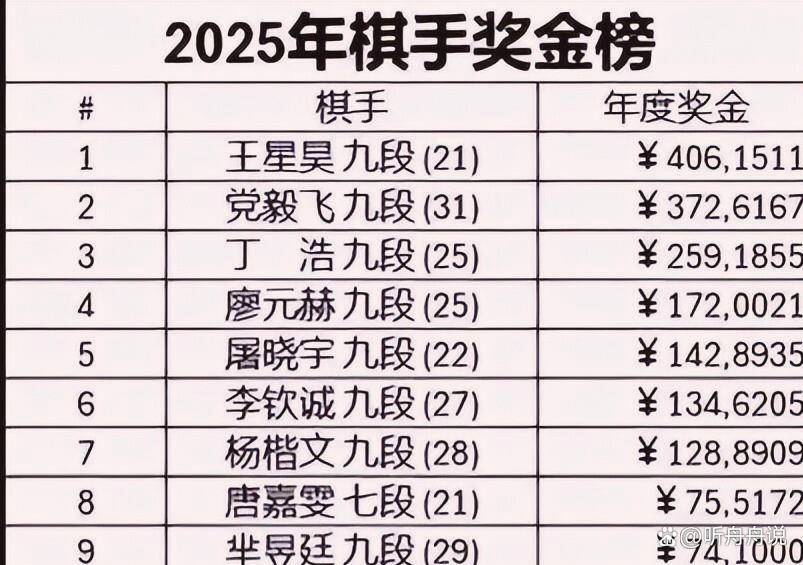 但中国拥有层次更丰富的国内赛事体系。 除了世界大赛,还有天元、名人、棋圣等传统头衔战,以及阿含·桐山杯等国手快棋赛。 这些比赛的冠军奖金从数十万到上百万人民币不等,为不同层次的棋手提供了更多争夺高额奖金的机会。 王星昊2025年的406万收入,就来源于北海新绎杯世界冠军、天元战冠军、阿含·桐山杯冠军等多个赛事的累积。
